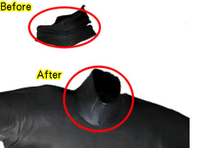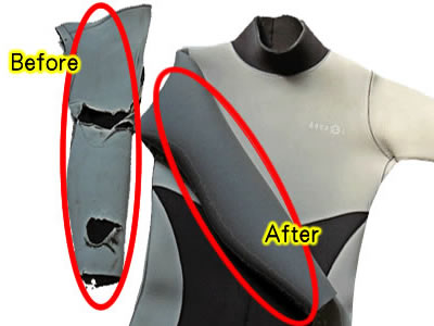 ウェットスーツがきつく感じる箇所の補正や、ボロボロになったところの修理をお求めやすい価格で提供いたしております。