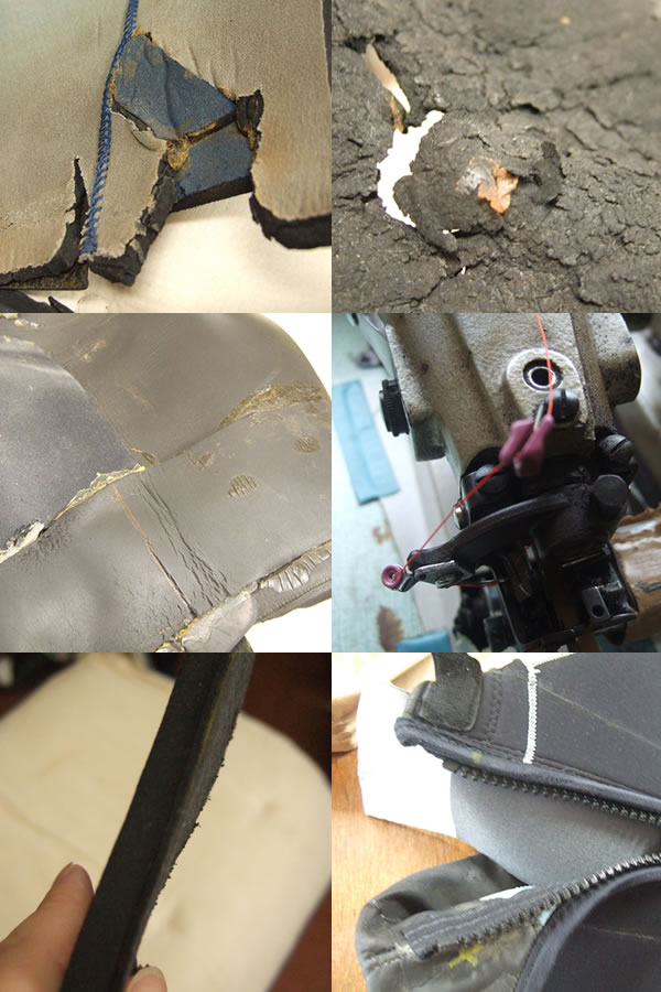 南九州は養殖業が盛んな地域で、生け簀の作業や網洗いなどでウェットスーツが酷使されやすく、特に膝部分が最初に擦り切れてしまうことが多いです。中には、膝の交換修理を4~5回、尻部分を2~3回行い、その他の修理を含め、1着のウェットスーツに対して3~4年で5回以上の修理依頼が来ることも珍しくありません。