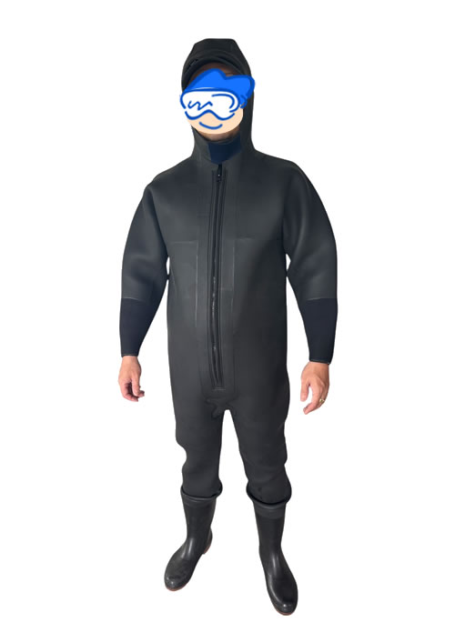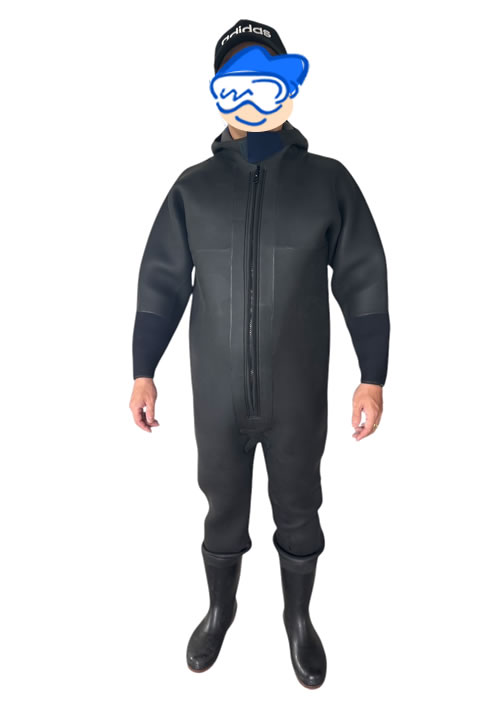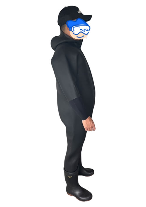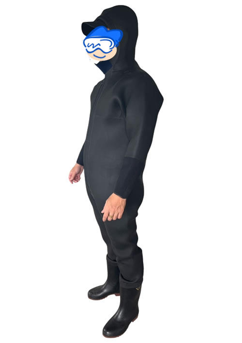 厳しい現場で、仕事に励んでいる方々の作業についていける、丈夫でしっかりとした造りの全身型胴付長靴(ダバスーツ)・肩付胴付長靴を、ウェットスーツ製造歴49年の経験・信頼・実績に恥じぬよう、一つ一つ丁寧に作り上げ、迅速にお届けいたします。