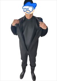 当社の全身型胴付長靴は、背丈・股下を基本にし、ゆとりを持ち製造いたしておりますので、着用時、身体にゆったりと寄りかかっているためにダバスーツの自重を感じないのです。