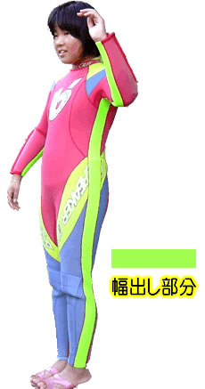 叔母様に譲ってもらったウェットスーツのサイズ広げ(補正)をしました。ウェットスーツの全体に両サイド幅出ししました(蛍光色部分5mm使用)。